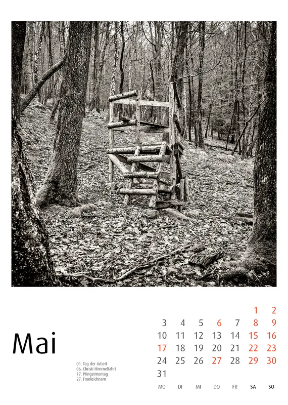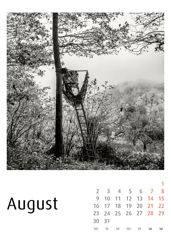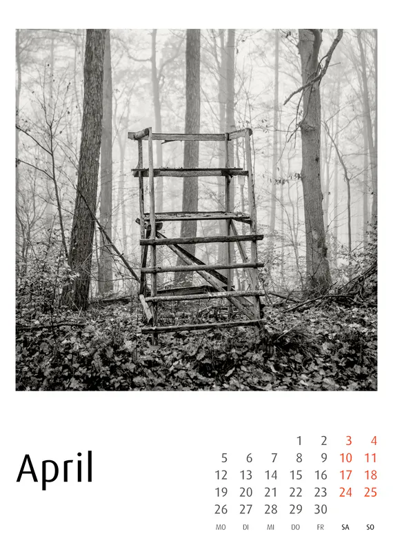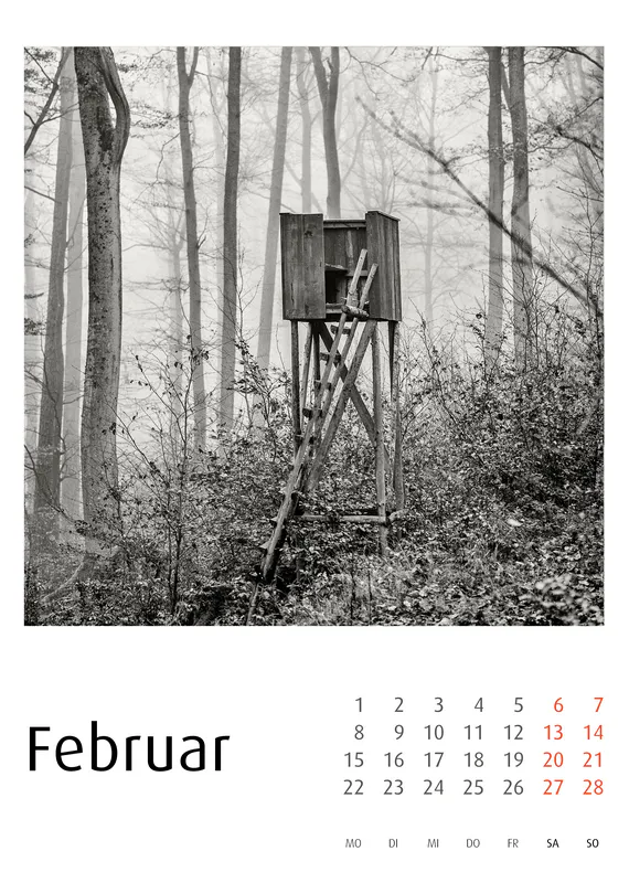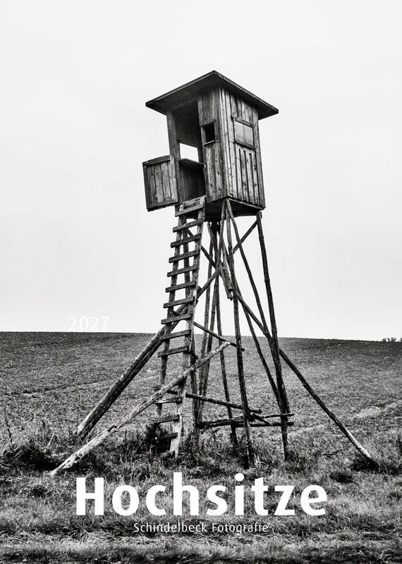 Der Hochsitze Kalender 2027 versammelt eine fotografische Serie über Jagdhochsitze in Landschaft und Wald. In konsequentem Schwarzweiß fotografiert, erscheinen die Konstruktionen als stille Architekturen im Raum – reduziert, grafisch, teilweise fragil. Dieser Hochsitze Kalender 2027 zeigt keinerlei Jagdszenen. Er zeigt Strukturen. Leitern, Plattformen, Verstrebungen und improvisierte Konstruktionen treten als formale Elemente hervor. Zwischen Nebel, kahlen Bäumen, winterlichen Feldern und weiten Horizonten entwickeln die Hochsitze eine beinahe skulpturale Präsenz.