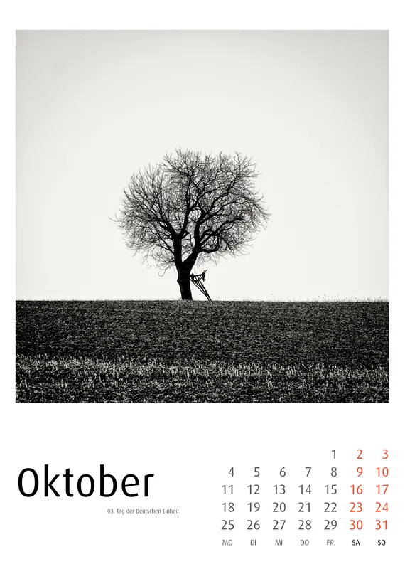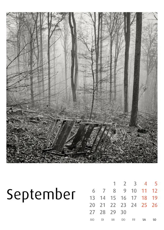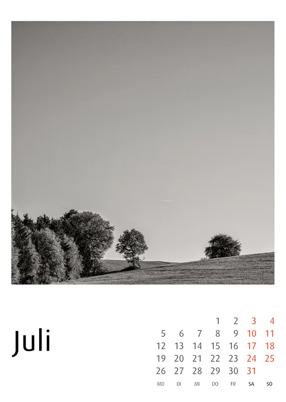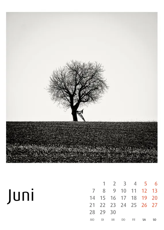 Die Serie folgt einer ruhigen Dramaturgie durch das Jahr: Winterliche Nebellandschaften, frühe Frühlingsstimmungen, sommerliche Weite und herbstliche Strukturen bilden einen reduzierten visuellen Zyklus. Als Schwarzweiß-Kunstkalender wirkt jedes Blatt auch als eigenständiges Fotomotiv. Die Bilder leben sowohl im Jahreskontext als auch als Einzelarbeiten.